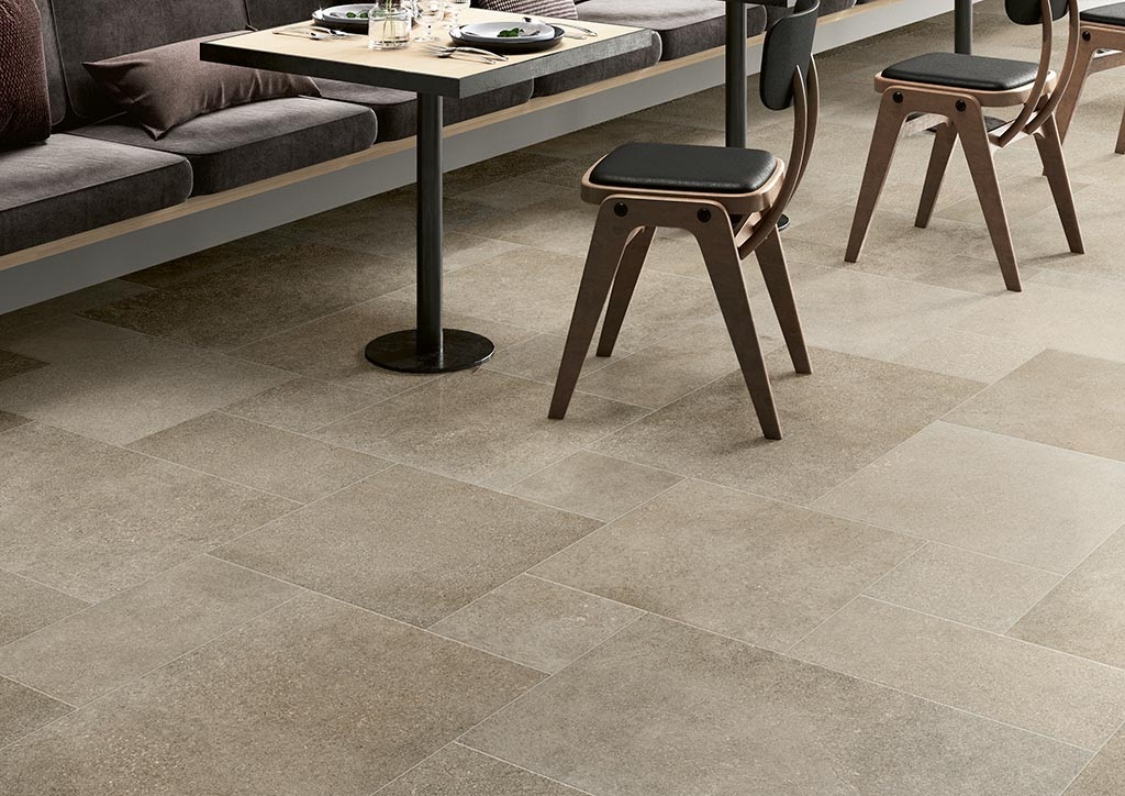 Slip-resistant honed limestone tiles with natural thermal mass—cool in summer, radiant in winter. Acid-resistant finish withstands vineyard use.