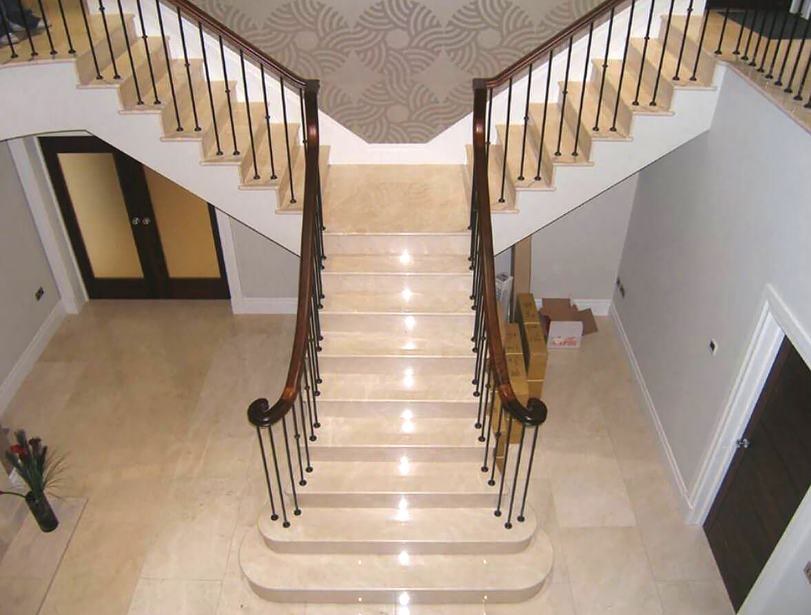 Non-slip limestone treads (R10 rating) reveal spiral fossils underfoot. Structural integrity lasts centuries, compatible with underlighting.